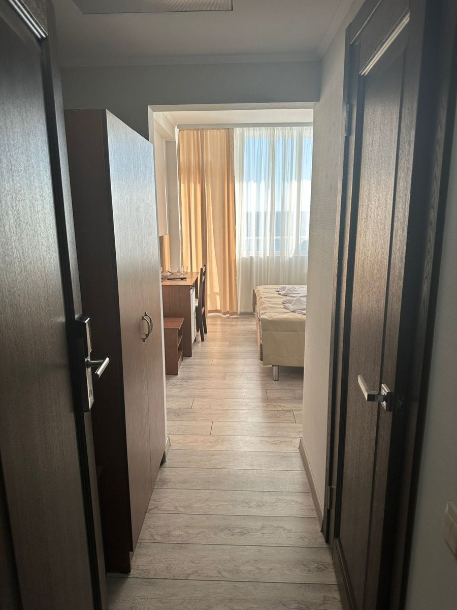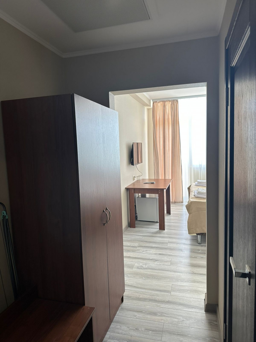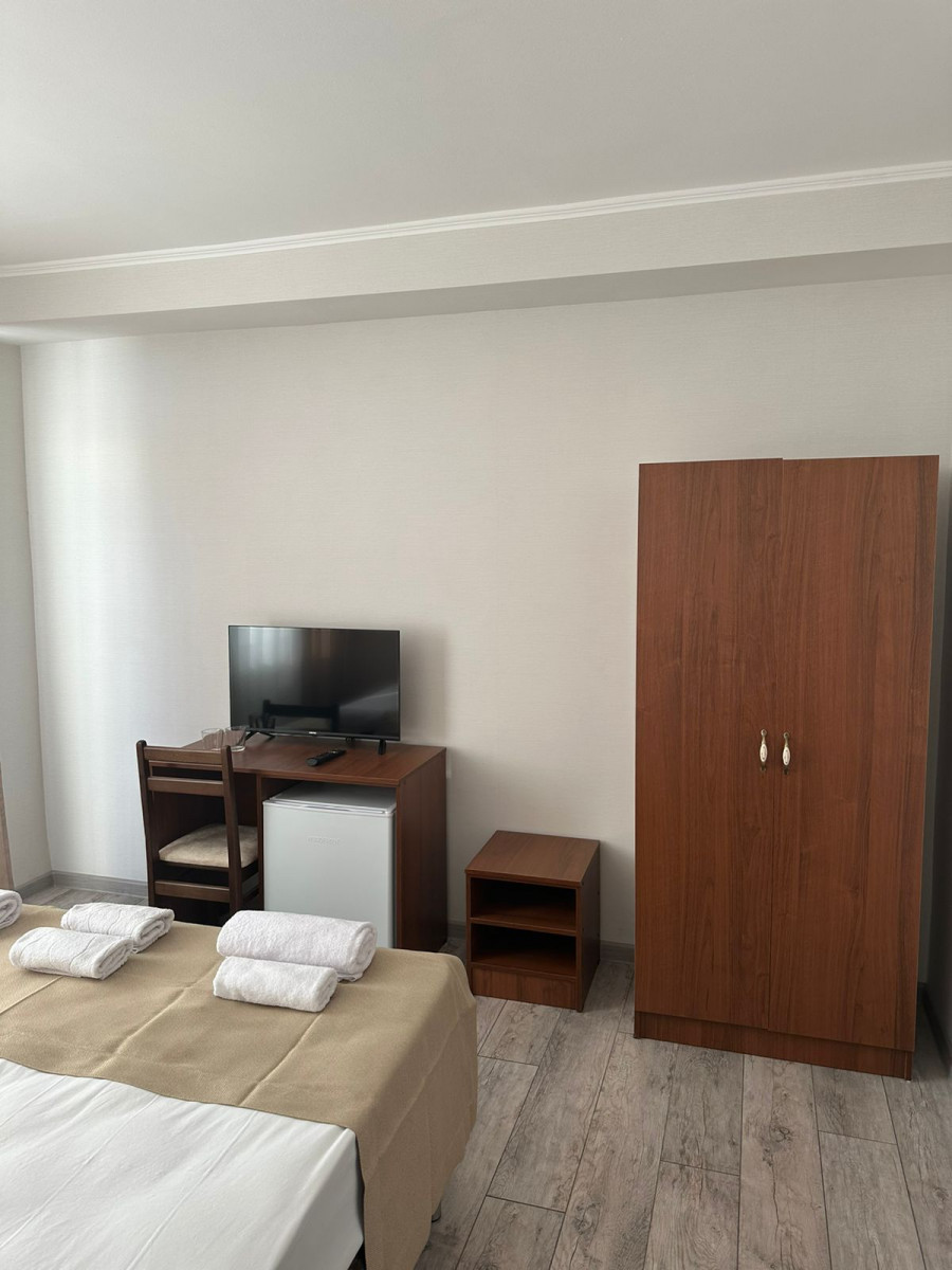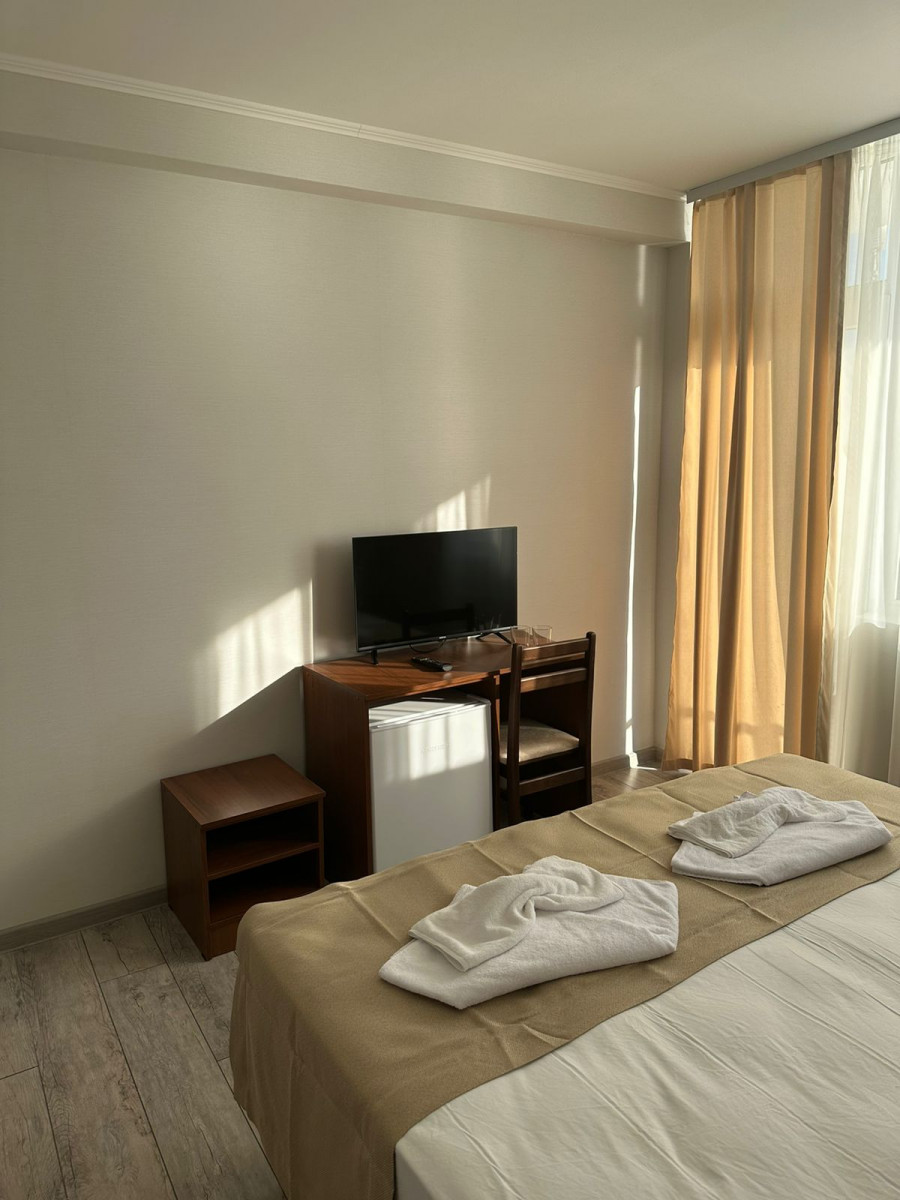Отель , обо всем по порядку: 1. Первая береговая, отличный вид из окна(у нас на море, 10 этаж, всего 16 этажей) 2. Все номера с балкона и, просторные. В номере двухспальная кровать, стол, стул, два табуретка, прихожая!, телевезиров, кондиционер, холодильник, санузел. Номера убирают каждый день, на каждом этаже своя горничная. 3. Еда: шведский стол, 3 вида гарниров, 3 вида салатов, 3 вида мяса, 2 вида десертов, напитки: вода, морс, чай, кофе, молоко. Голодными точно не останетесь! 4. Персонал доброжелательный, всегда помогут, услуги не навязывают 5. Местные тоже стараются, чтоб отдохнули хорошо, всегда спрашивают, нравится ли вам у нас, всегда готовы придти на помощь. 6. Wi-Fi работает, на территории отеля, до моря хватает Единственная проблема-это трансфер до отеля, но если вас не пугает дорога, то можете смело планировать отдых, лично мы забыли про этот минус, оказавшись в холле отеля) Всем приятного отдыха!