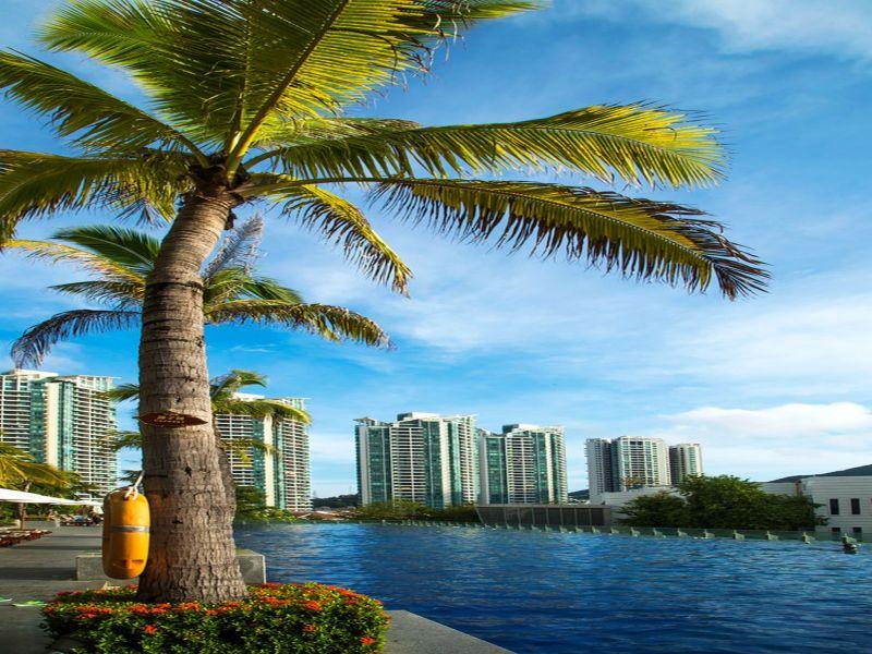 у подножья горы Luhuitou, на устье реки «Санья» между бухтой Дадунхай и центром города Санья, в 17 км от аэропорта, в 3 км от центра города, в 3 км от центра бухты Дадунхай.
