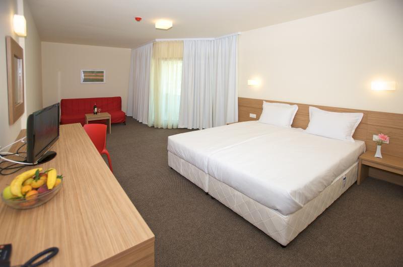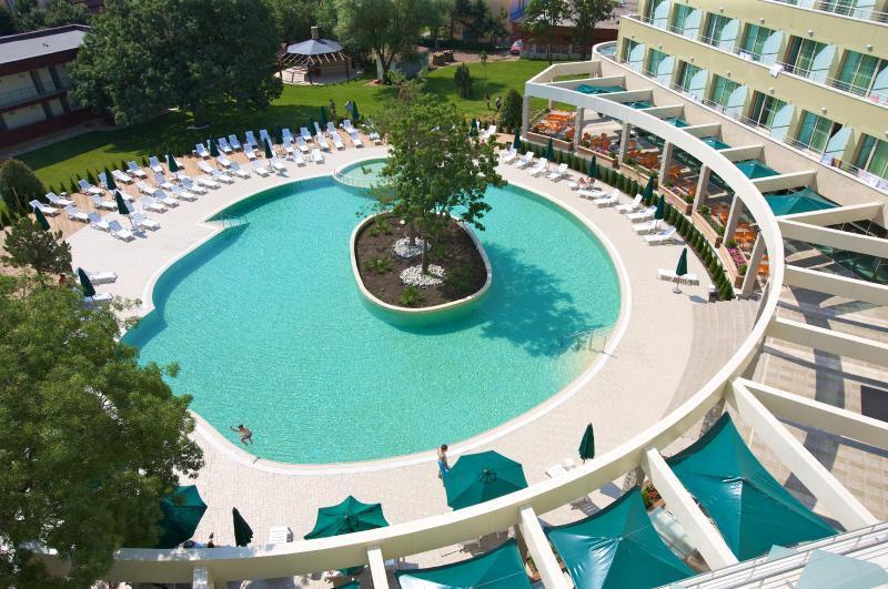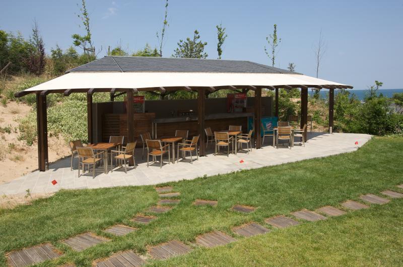 Песчаный пляж в 100м от отеля, шезлонги и зонтики - платно.