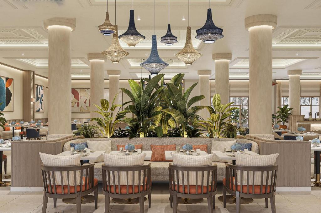 Жили на 2 линии. В номерах косметический ремонт, мебель не новая, но в хорошем состоянии, деревянная. Постельное белье хорошего качества, меню подушек (подушки не ахти, по размеру немного больше наволочек). На моей 2-спальной кровати в пододеяльнике 2х2 было вставлено одеяло 2х1,6... Уборка приемлемая. Совет: если не боитесь ходить, просите самые дальние корпуса, подальше от анимации, так как она достаточно шумная. По звонку на ресепшн можно вызвать багги к номеру, но мы ходили пешком, от аквапарка до ресепшн 3 минуты ходьбы. Больше всего замечаний к ресторану, он отвратительный: персонал не справляется с потоком отдыхающих, замученные официанты, которые тебя просто не замечают, отсутствие мест, толпы, очереди, на улице официанты занимают столики посудой и отдают тебе только за чаевые, бармены хамят. Внутри включают кондиционеры так, что тебя сдувает со столика (наверное, чтобы быстрее ели и освобождали место)). Еда так себе, выбор вроде есть, но некоторые позиции быстро разбираются и их не успевают пополнять. Всё какое-то невкусное или безвкусное. В общем, если считать, что это столовая, а не ресторан, то сойдёт. А ля карты - та же самая еда, но в спокойной обстановке. Некоторые отдыхающие умудряются курить прямо во время еды, обкуривая соседние столики (на улице). Эти же отдыхающие будут вас обкуривать и на пляже, без всякой задней мысли. Приходится делать замечание. На пляж возит багги, там достаточно тесно, вход с берега коралловый, лучше в тапках, понтон пластиковый. Участок моря тоже маленький, когда отель полный, то и в море, соответственно, все как сельди в бочке. Если вы без детей, можно пользоваться инфраструктурой и ресторанами на 1 линии и шезлонгами части пляжа 16 плюс. Первая линия выглядит слегка заброшенной, так как там много корпусов, закрытых на реновацию. Мы ходили на пляж Gafy, там отличный вход по песку. Но говорят, что летом оттуда выгоняют. Вывод, для такого качества очень завышенная цена. Бегать добывать себе места в ресторане и тесниться на пляже и в море - ну такое себе.