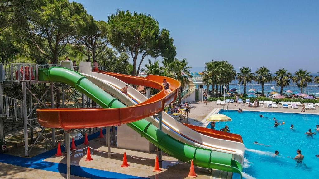 Отель прекрасный!! Очень советую! Были с семьёй моей подруги. Горки огонь! Бассейн чистят каждый вечер.еда вкусная, особенно лаваш . Море чистое, в 50 км через море виден греческий остров. По русски (кроме пары кучек туристов) говорили в магазине через дорогу и в одном из магазинов отеля В самом отеле есть два магазина : один с одеждой, кроксами, шляпами и т.д. , второй с мороженым , сладостями, плавал тельными принадлежностями и т.д.
