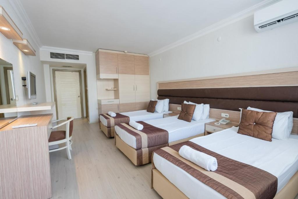 Отель понравился! Расположение лучше и не придумаешь - первая линия, рядом Migros, кафе, оутлеты. В номере все чисто и все работало (холодильник, телевизор, сейф, фен, кондиционер). Мебель старовата, но ремонт свежий. Ежедневная уборка и замена полотенец (6 шт. на двоих). Завтраки стандартные - омлет, яйца, хлопья, овощи - помидоры и огурцы, фрукты - арбуз и дыня, сыры, оливки, колбасы. Брали тур на неделю за 105 тыс. на двоих. Прилетели в 7 утра сразу заселили и накормили завтраком, персонал всегда рад помочь. Брали скутер на неделю и катались по окрестностям. Отдохнули супер, чего и всем желаем!