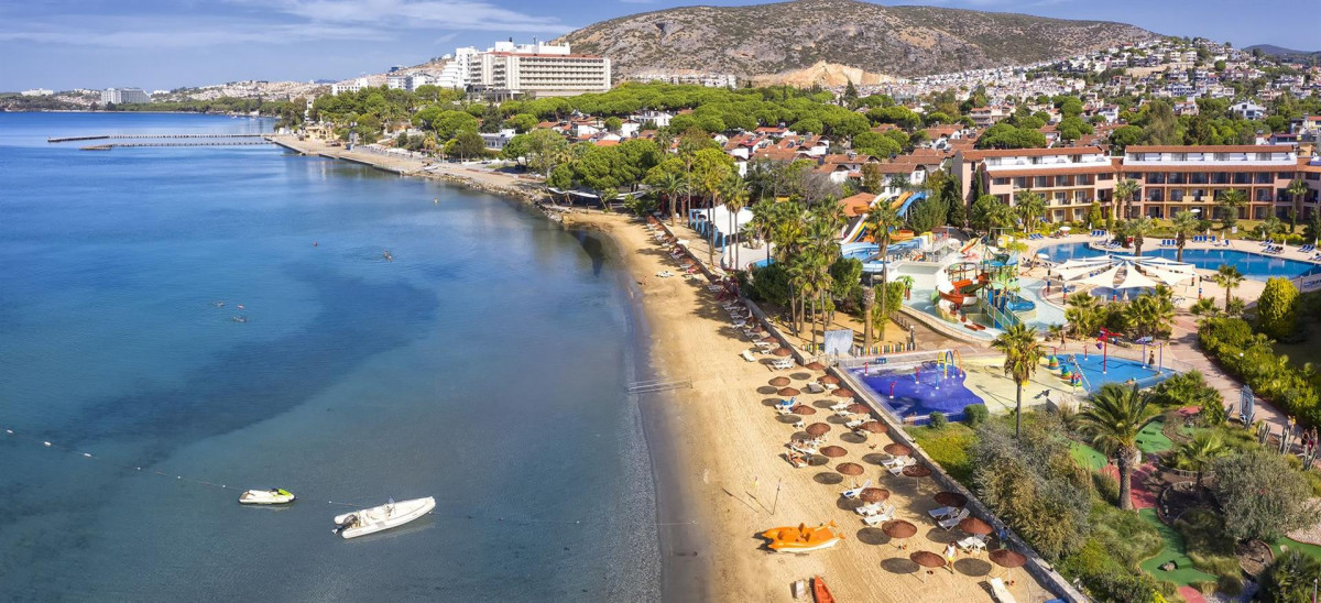 Были в этом отеле с мужем в октябре 2020. От номера были в восторге: современный дизайн, все чисто, красиво, вид на море; жили на третьем этаже. Было ощущение, что мы жили первые после ремонта. Территория отеля большая и зелёная, несколько бассейнов, в том числе детских, лежаков предостаточно. Пляж чистый, песчаный, встречалась мелкая галька на мели. Лежаков на пляже тоже достаточно. Море чистое, даже в октябре очень тёплое. Есть небольшие горки, мне хватило для получения дозы адреналина :) Еда разнообразная, вкусная, каждый день менялась. Изысков вроде морепродуктов не было, но была белая рыба. Но овощей много и все свежие, вкусные, фрукты сладкие, огромный выбор десертов (кроме огромного выбора турецких сладостей были чизкейки и разные пирожные и торты), по несколько видов супов каждый день. В ресторане из напитков - соки, чаи, кофе, вино, пиво. Ресторан Аля карт был закрыт из-за ковидных ограничений, но бары на пляже и бассейна всегда работали. Персонал вежливый, доброжелательный. Про анимацию сказать не могу, она вроде была, но нас не интересовала. Недалеко от отеля античный город Эфес, просто потрясающая экскурсия. Рядом с отелем небольшой рынок, в паре километров большой ТЦ с привычными для нами магазинами - Colins, Cotton и тд. Это была наша первая поездка в Турцию и в том числе и благодаря данному отелю мы влюбились в эту солнечную страну!