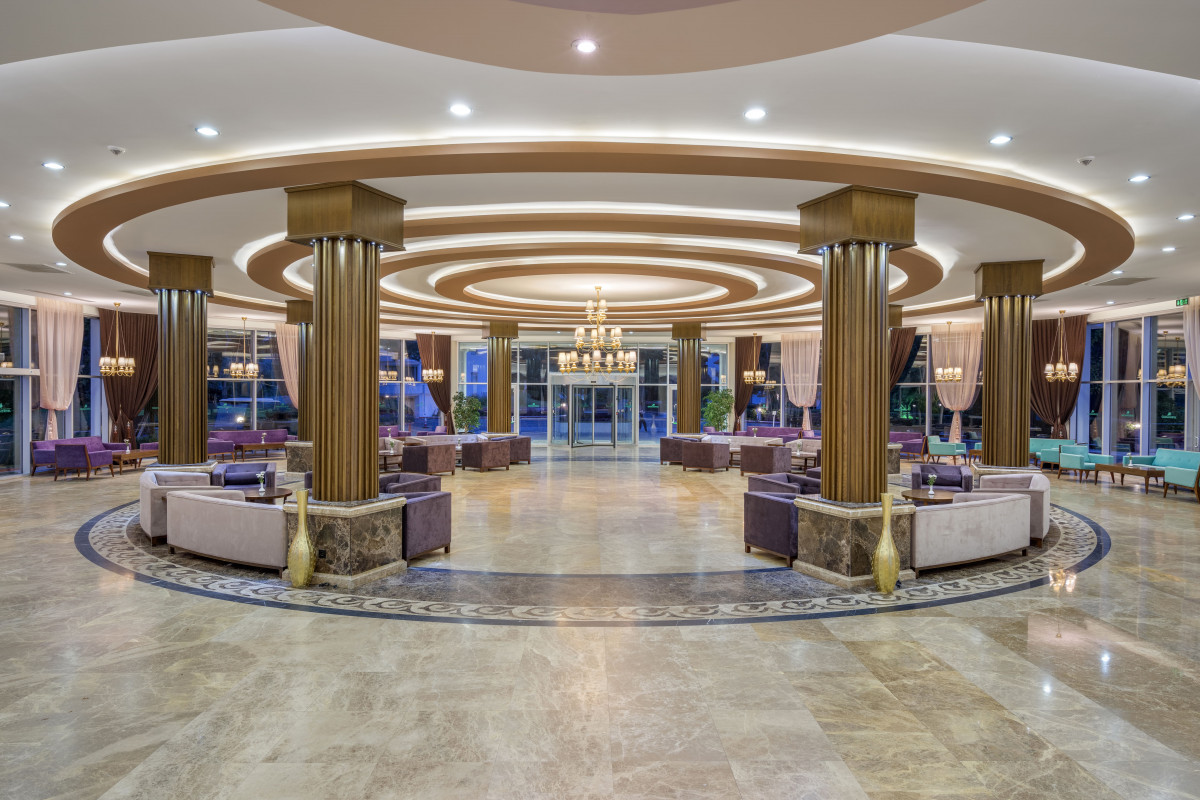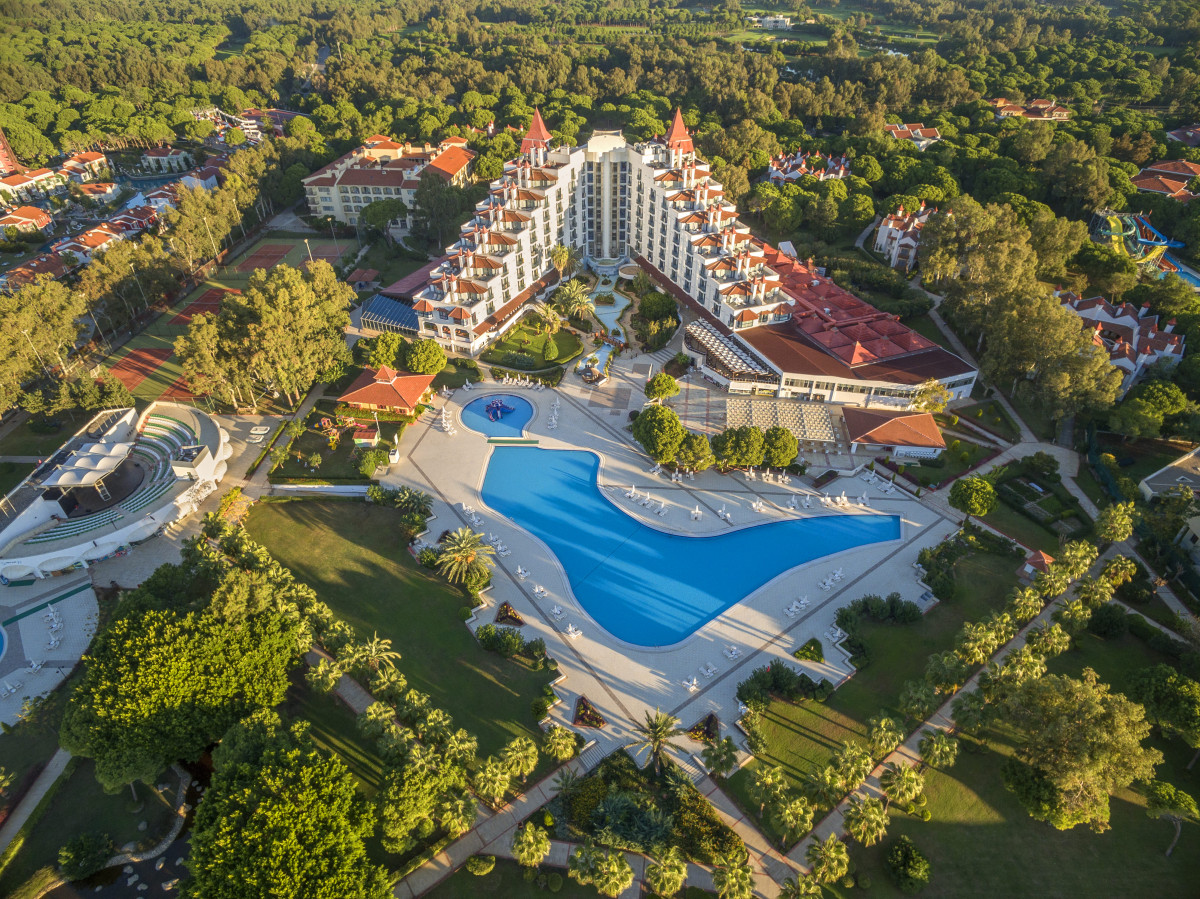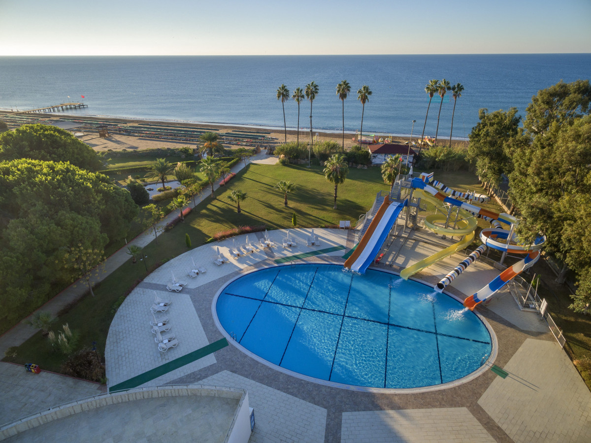 Плюсы отеля: * Отличный заход в море, песчаный пляж. Для малышей самое то. Утром почти штиль, а к вечеру все дни были волны, в которых весело кувыркаться детям. * Аквапарк 6 горок. * Питание на 5 плюс. Очень разнообразно и вкусно. Много мест для перекусов, кроме основного. Отличные бары. * Чистота. Персонал всюду шуршит постоянно, наводя порядок. Уборка в номере ежедневно. * Персонал, вообще, образцовый. Перегоревшую лампочку в ванной заменили через полчаса. Все вопросы решались быстро и вежливо. * Просторные номера (корпус Zeus). * Красивый сад на территории. * Анимация на трёх языках (турецкий, английский, русский). Мы особо не посещали, но многие отдыхающие участвовали. * Вечером на территории отеля работают мини-аттракционы для малышей, есть бильярд, теннисные столы и корты, футбольная и баскетбольная площадка. Минусы: * Номера "уставшие", ковролин чистый, но старый. Явно, пора делать обновление в ванной комнате. Кондиционер шумный. * Рядом с отелем лес, пустыри и другие отели. Гулять по магазинам - если кому надо - то ехать на маршрутке или такси. * Комаров мало, но они есть. В целом отдыхом довольны!