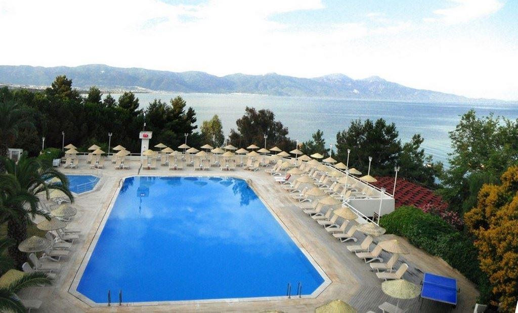 в 80 км от аэропорта г. Измир, в 114 км от аэропорта Бодрума, в 6 км от центра г. Кушадасы, на берегу моря. До античного города Эфес 25 км.