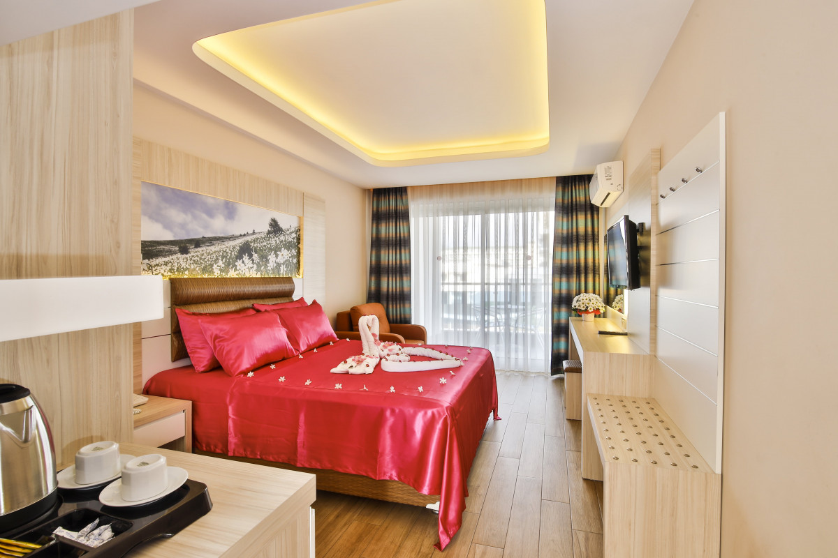 Отель хороший, отдых в нем нам понравился, отдыхали в конце мая 2025 г. по номеру: кондиционер работал исправно, кровати хорошие, белье не первой свежести, но его меняли раз в два - три дня. Горничные убирались каждый день, за скромные чаевые предоставят недельный запас воды и лебедей с цветами накрутят вообщем умнички! Вода горячая была всегда, телек имелся с пару русскими каналами. По еде: большой выбор овощей, зелени. Завтраки однообразные, набор всегда один и тот же, омлет, глазунья, панкейки, жареные пышки, варенные яйца, каша рисовая молочная, сосиски, сыры разнообразные, свежие овощи, оливки всякие вариации, вкусный кофе короче прям сто процентов наешься. В обед была и рыба, и мясо и курица, и фаршированные перцы и всякая всячина. Короче еды навалом, еда вкусная! Фрукты в основном это груш , яблоки, апельсины. Пару раз был арбуз. Но фишка в том что от отеля пару остановок проехать можно на автобусе и попасть на рынок, где за копейки можно купить все что хочешь из овощей и фруктов. Наелись мы клубники и черешни за копейки. В номере есть холодильник, но холодит он слабовато пришлось почти все сразу съесть то что с рынка привезли. Пляж недалеко, лежаков всегда хватало, бар работает на пляже. И соки и пиво есть бесплатное. Персонал супер приветливый, мы были с ребенком годовалым, так нас вниманием и заботой окружили просто. Турки очень любят детей. Вообщем спасибо за шикарный отдых, советую этот отель. За бюджетную цену хорошо отдохнули.