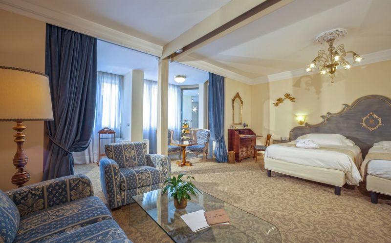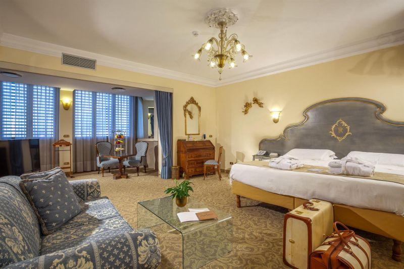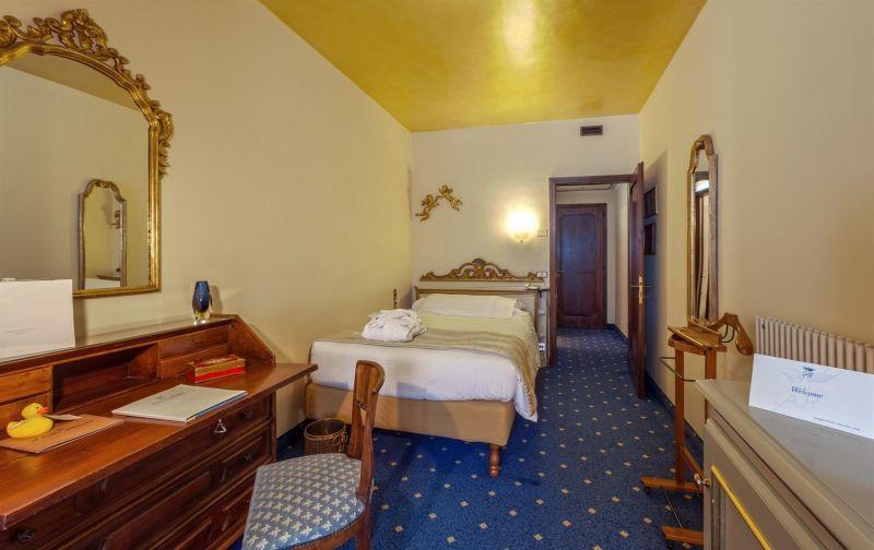 4 номера design на пятом этаже, 12 Suite и Junior Suite, 56 двухместных или супружеских номеров “elegant”, все с гостиной, некоторые с просторной террасой, а на первом этаже также без коврового покрытия; 38 одноместных номеров с двуспальной кроватью; 31 двухместный и одноместный классический стандартный номер.